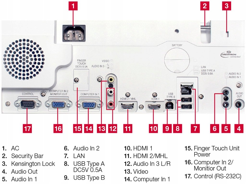 Type A x 2 (PC-less presentation, wireless adapter) Type B x 1 (USB display or mouse control)