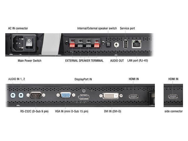 1x VGA (60Hz@1920x1080), 2x HDMI, 1x DisplayPort, 1x DVI, 1x USB-B (Touchfunktion), 1x Jack 3.5mm Line Out, 2x Jack 3.5mm Line In, 1x RJ-45, 1x port szeregowy
