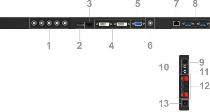 1x VGA (60Hz@1920x1080), 1x RCA Component, 1x RCA composite-In, 1x HDMI 1.3, 1x DisplayPort, 1x DVI, 1x USB (Touchfunktion), 1x RJ-45, 1x port szeregowy