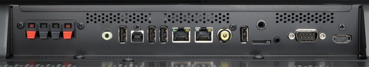 1x VGA (60Hz@1920x1080), 1x RCA composite-In, 2x HDMI 1.3, 2x DisplayPort, 1x DVI, 1x HDMI-Out, 1x DisplayPort-Out, 1x Jack 3.5mm Line Out, 2x Jack 3.5mm Line In, 2x RJ-45, 1x port szeregowy, 1x JAE 80-Pin OPS, 1x microSD