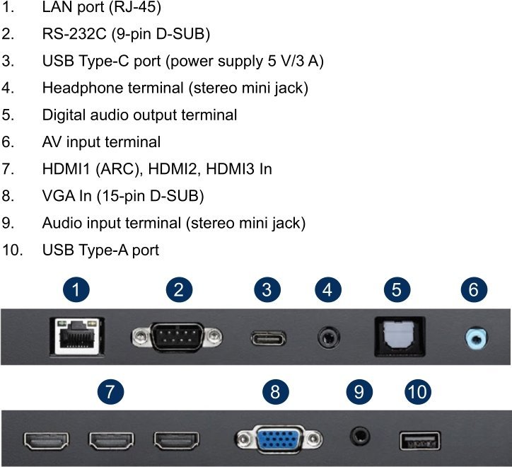 1x VGA, 3x HDMI 2.0, 1x USB-A 2.0 (480Mb/s), 1x Toslink S/PDIF Out, 1x Jack 3.5mm Line Out, 1x Jack 3.5mm Line In, 1x RJ-45, 1x port szeregowy, 1x USB-C (zasilania sieciowe)