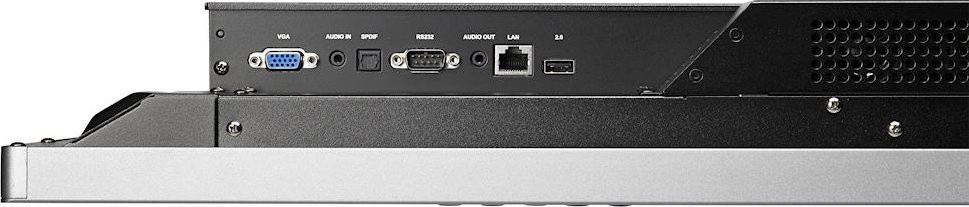 1x VGA, 3x HDMI 2.0, 1x HDMI-Out 2.0, 3x USB-A 3.0 (5Gb/s), 3x USB-A 2.0 (480Mb/s), 2x USB (Touchfunktion), 1x Toslink S/PDIF Out, 1x Jack 3.5mm Line Out, 1x Jack 3.5mm Line In, 1x RJ-45, 1x port szeregowy