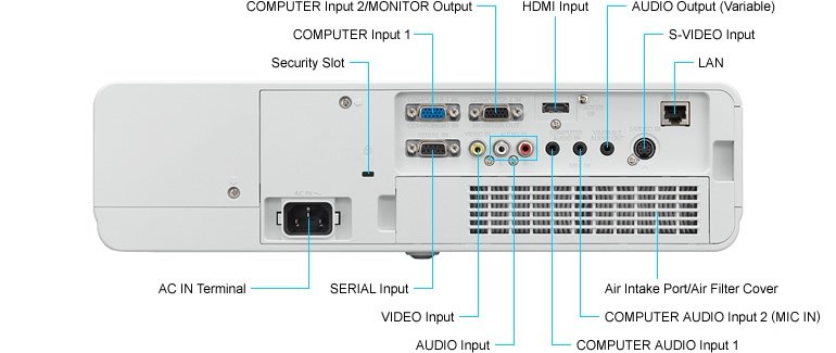 Projektor posiada złącze HDMI, 2 wejścia komputerowe (RGB) terminal przewodowy LAN oraz terminal (RS-232C) do sterowania zewnętrznego.