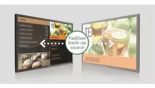 Zapewnienie stałego dostępu do materiałów ma decydujące znaczenie dla wymagających zastosowań komercyjnych. Choć jest mało prawdopodobne, że prezentowane materiały ulegną zniszczeniu, warto skonfigurować tryb awaryjny (FailOver), ponieważ zapewnia on ochronę zawartości dzięki rewolucyjnej technologii, która odtwarza określone treści na ekranie w przypadku awarii odtwarzacza multimedialnego. Zabezpieczenie to włącza się automatycznie w razie awarii podstawowego źródła sygnału. Wystarczy wybrać podstawowe źródło sygnału oraz połączenie na potrzeby trybu awaryjnego, aby zyskać natychmiastową ochronę.