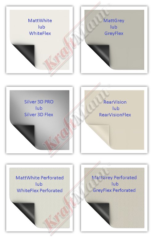 - Podłoża Matt White/Grey (Plus/Pro/HD), Reference White/Grey, Vision White (Pro), Clear Vision, Gray Pro, Astral, White Ice, New Coral, Rear, Rear DB, Vision Acoustik, Silver, inne dowolne ...