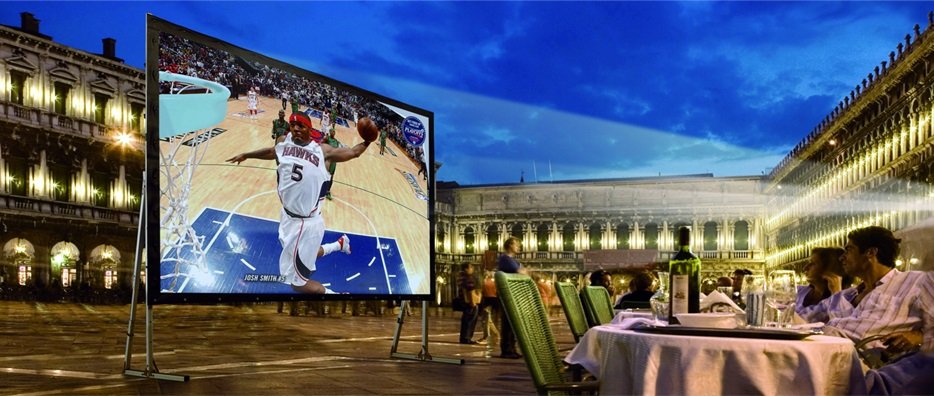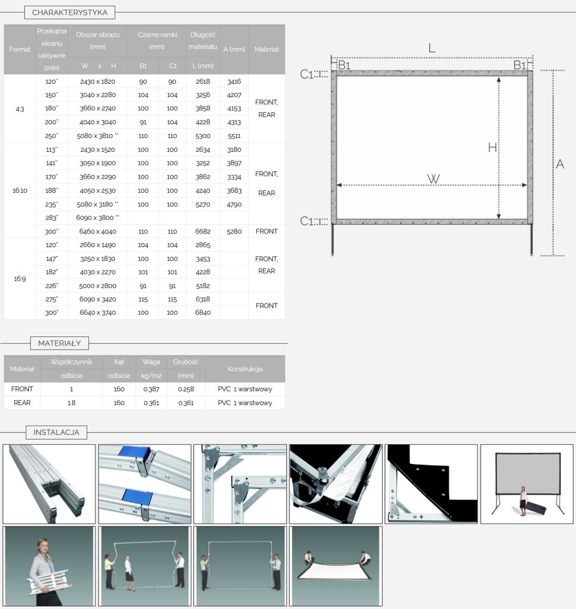 W zestawie: aluminiowa rama ekranu, nogi, powierzchnia projekcyjna, skrzynia transportowa,