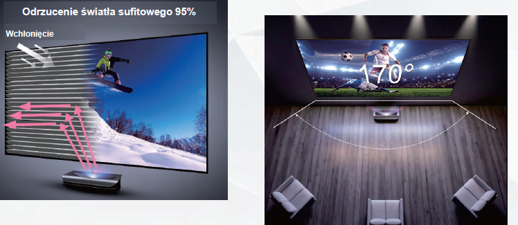 Jego wysoce odblaskowa powierzchnia projekcyjna zwiększa jasność i kontrast, jednocześnie przeciwdziałając efektowi rozmycia światła otoczenia. Idealnie nadaje się do pomieszczeń z oświetleniem
