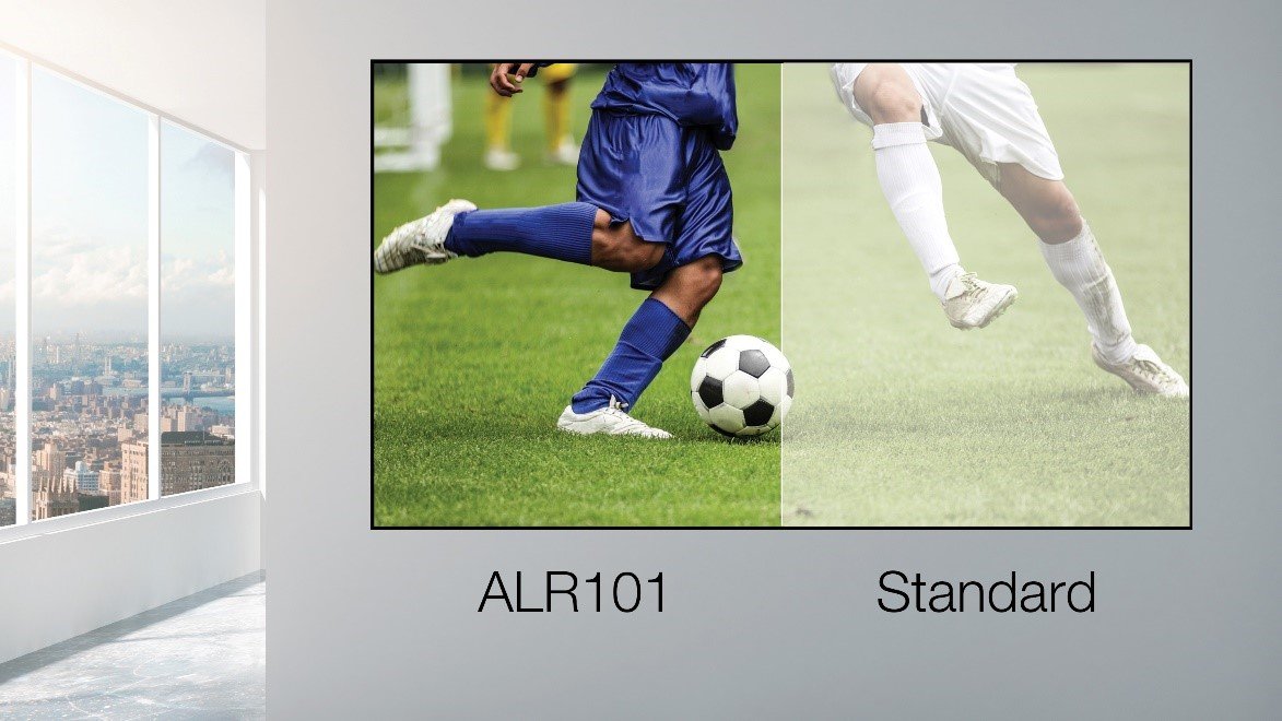 Ten wysokiej jakości ekran projekcyjny z przodu jest tak skonstruowany, aby uzyskać żywe obrazy nawet w jasno oświetlonych pomieszczeniach. Technologia ALR przechwytuje światło z projektora o ultrakrótkim rzucie umieszczonego pod ekranem i odrzuca światło, które pada na ekran z góry.