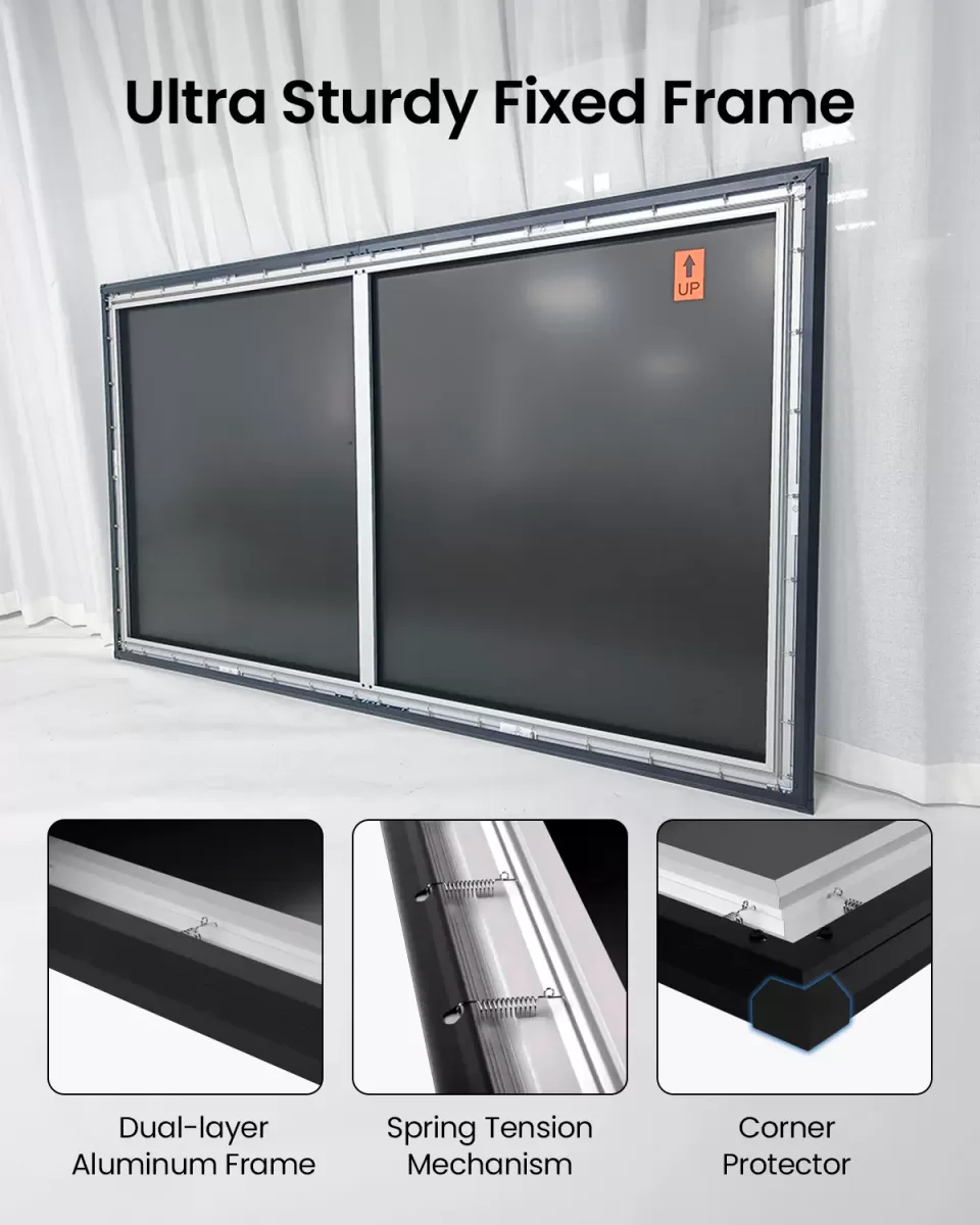 - Solidna aluminiowa stała rama : Ten ekran ma solidną aluminiową ramę z systemem mocowania sprężynowego. Łączy stabilność strukturalną z łatwą instalacją i elastycznymi możliwościami regulacji, zapewniając wyjątkowe wrażenia użytkownika. (Możesz znaleźć konkretne filmy instruktażowe online.)