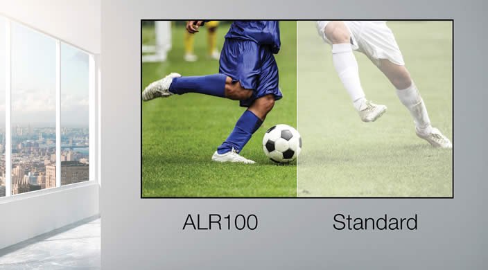 Ten wysokiej klasy ekran projekcyjny przedni jest zaprojektowane tak, aby osiągnąć żywe obrazy nawet w jasno oświetlonych pomieszczeniach. ALR100 wychwytuje światło ultra short throw projektora umieszczonego poniżej ekranu i odrzuca światło, które pada na ekran.