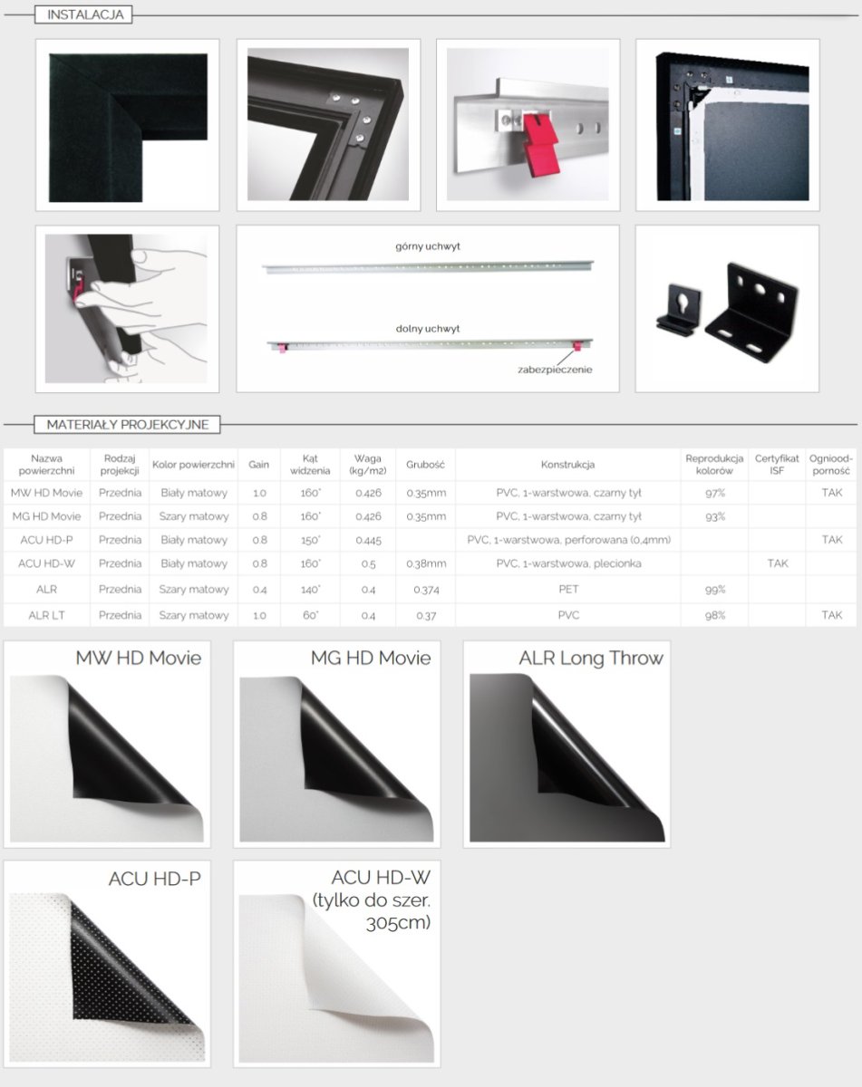 Powierzchnia projekcyjna rozpinana na ramie gwarantującej idealnie gładki obraz,
