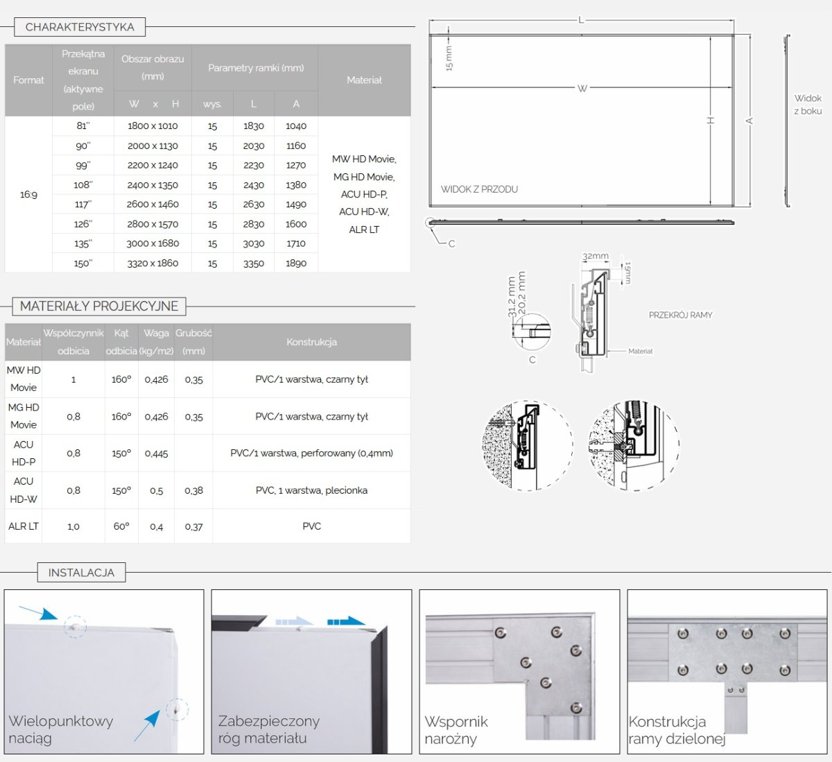 Powierzchnia projekcyjna rozpinana na ramie gwarantującej idealnie gładki obraz,