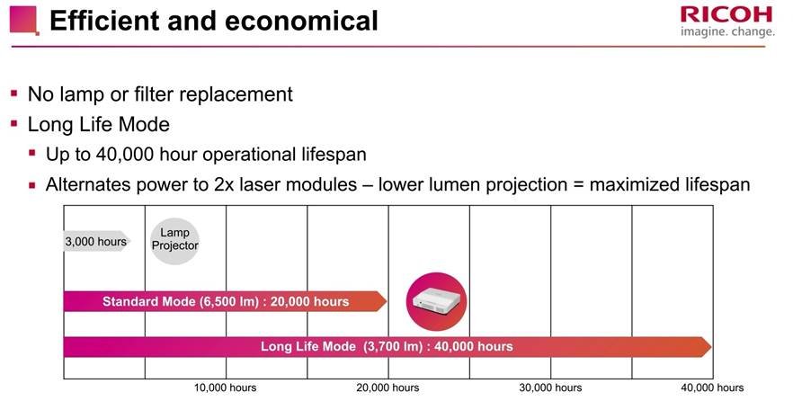Wydajność i oszczędność są również podstawą konstrukcji projektora. Koszty posiadania i wymiany są zmniejszone dzięki wyjątkowo długiej żywotności operacyjnej wynoszącej 40 000 godzin w trybie Long-Life, bez konieczności wymiany filtrów lub lamp. Dzięki aplikacji pozwalającej na jednoczesną obsługę do 100 projektorów i dołączonemu oprogramowaniu, projektor laserowy RICOH PJ UHL3660 UST stanowi niezwykle wszechstronne rozwiązanie w jakości 4K w jednym pakiecie.