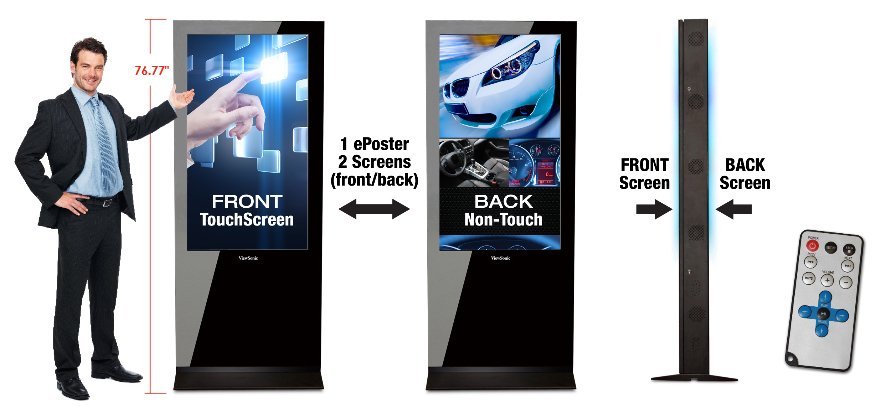 ViewSonic 55 "EP5555T zapewnia innowacyjny i przyciągający uwagę sposób, aby zwrócić uwagę na Twój biznes, sklep lub najnowszą kampanię. EPoster oferuje 55" Full HD 1920 x 1080 ekrany po obu stronach i dwa wewnętrzne głośniki 5W. Wyświetlacz wyposażony jest w 2GB pamięci Compact Flash (CF), dwa wewnętrzne odtwarzacze multimedialne i panele przednie z hartowanego szkła dla ochrony ekranów. Dzięki konstrukcji wszystko-w-jednym (all-in-one), wbudowanym gniazdom sieciowego i podstawom montażowym do dodawania własnych odtwarzaczy, EP5555T jest bardzo łatwy w obsłudze. Jest nawet zautomatyzowane Power On / Off do łatwego planowania operacji.