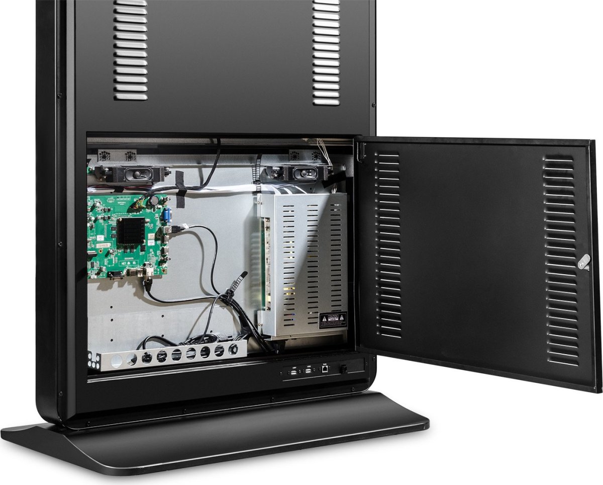 Wygodna podstawka odtwarzacza multimedialnego może pomieścić komputer PC lub dodatkowy zamontowany odtwarzacz multimedialny, a zamykane drzwiczki zapewniają bezpieczeństwo i niewidoczność. Stojak ePoster posiada również zintegrowany zasilacz, eliminując potrzebę znajdowania alternatywnych gniazd dla urządzeń dodatkowych.