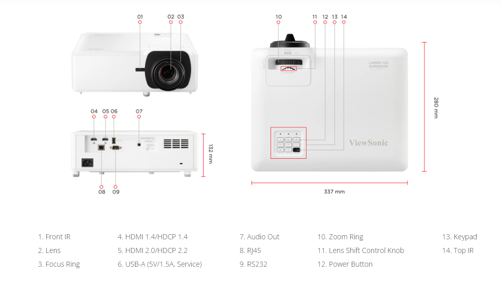 - Elastyczność instalacji: 1,7-krotny zoom, przesunięcie obiektywu w pionie, korekcja trapezu w poziomie i pionie oraz projekcja 360°