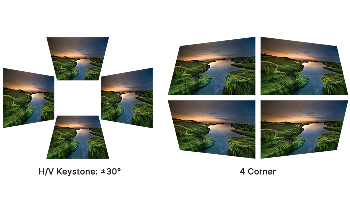 Projektor obsługuje korekcję trapezową w pionie i poziomie oraz korekcję czterech narożników, co ułatwia instalację i zapewnia idealne proporcje obrazu. Dzięki poziomemu i pionowemu przesunięciu obiektywu, nawet jeśli projektor nie może być umieszczony centralnie, obraz można precyzyjnie dostosować.