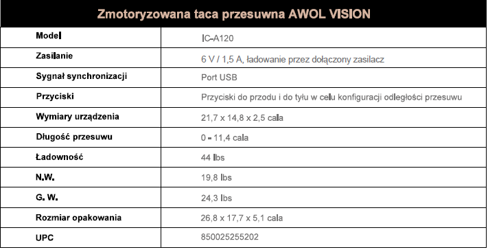 Nie martw się więcej! Dzięki zmotoryzowanemu sliderowi AWOL VISION IC-A120 możesz idealnie ustawić projektor tak, aby uzyskać pożądany rozmiar obrazu, bez konieczności stosowania drogich, specjalistycznych mebli UST. Zmotoryzowana przesuwana taca AWOL VISION IC-A120, synchronizuje się z projektorem laserowym UST za pośrednictwem sygnału portu USB, konfigurowalna odległość przesuwania, umożliwia dostosowanie projektora UST do praktycznie każdego salonu lub zestawu kina domowego.
